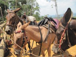 Weiter geht es am nächsten Tag auf Maultieren. Fünf Stunden über Stock und Stein, durch Wälder und Hügel, und noch mehr Hügel, immer tiefer ins Landesinnere. Dazwischen haarsträubende Abhänge herunter bei denen wir fürchten, vom Lasttier zu fallen, um danach noch steiler den Berg hoch zu trotten. Die Sonne scheint erbarmungslos, die rote Erde umhüllt uns in einer Staubwolke. Nach ein paar Stunden spüren wir nicht mehr alle Körperteile und sind von Sonne, Hitze und Müdigkeit benebelt. Nur die Maultiere kümmert das wenig, Schritt um Schritt bringen sie uns an unser Ziel, das Dorf El Carmen.